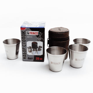 Набор из четырех стопок. Стопки изготовлены из нержавеющей стали. Кожаный чехол в комплекте. Такой набор не занимает много места, его удобно взять с собой в путешествие. Объем стопок — 80 мл.