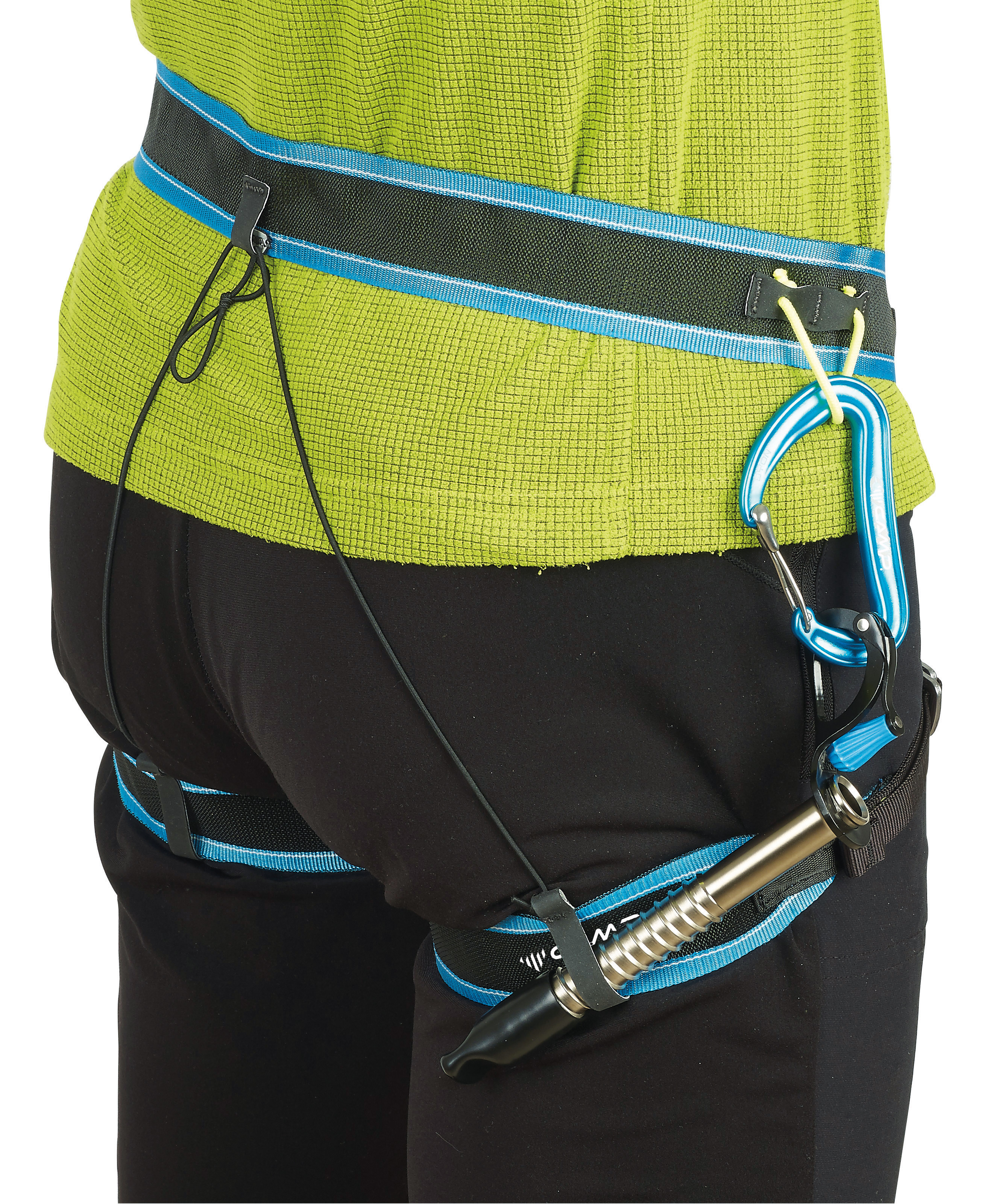 В основе конструкции лежит инновационный материал — сверхлегкое, дышащее нейлоновое моноволокно, дополненное высокопрочным полиэтиленом, что обеспечивает оптимальный баланс веса и долговечности. Регулировка высоты петель для ног осуществляется с помощью эластичного шнура, который фиксируется узлом, предотвращая их сползание вниз. Две разгрузочные петли можно быстро отсоединить при необходимости с помощью специальных пазов, в которые также могут размещаться вспомогательные карабины HUB для переноски ледобуров.