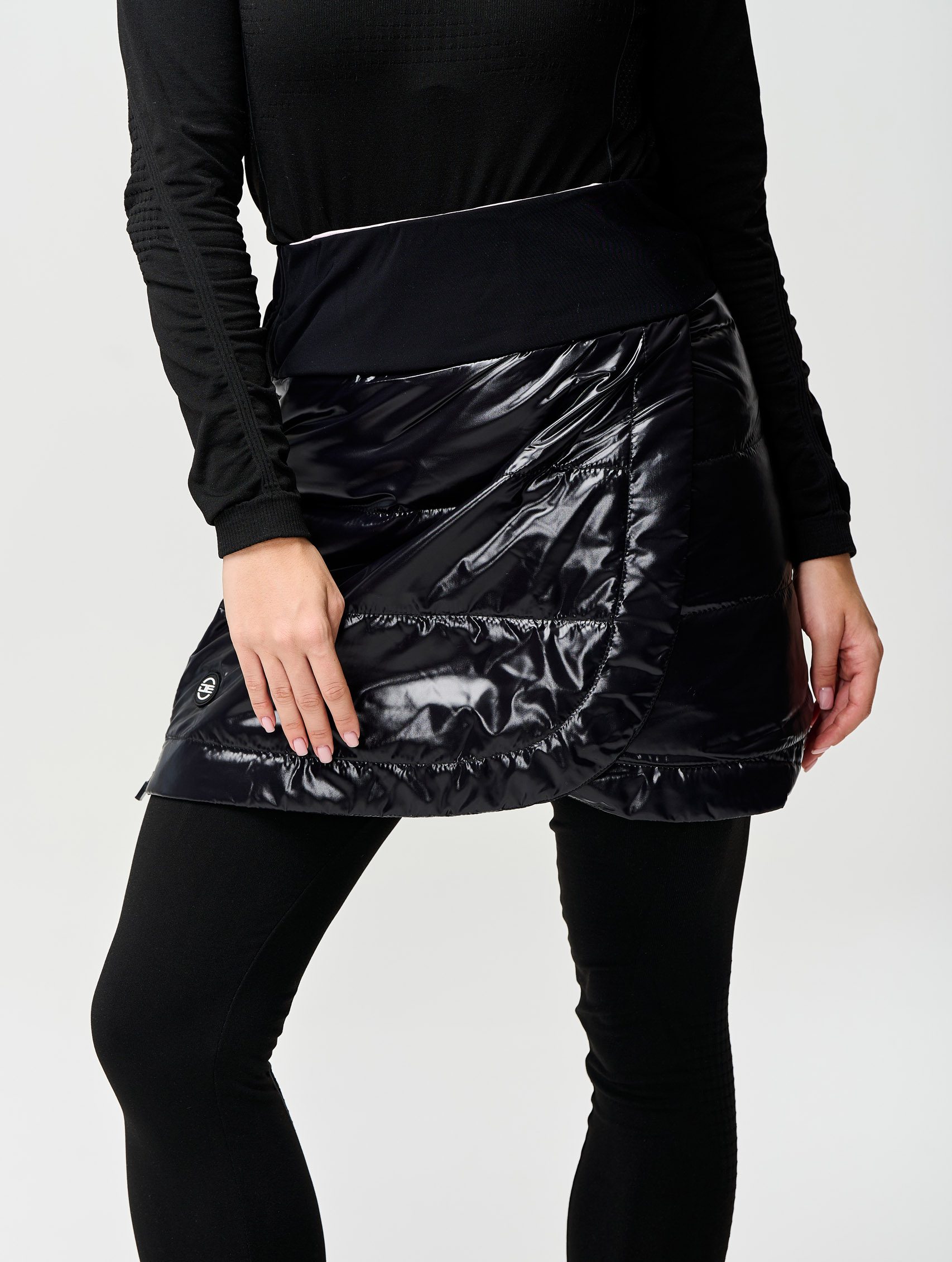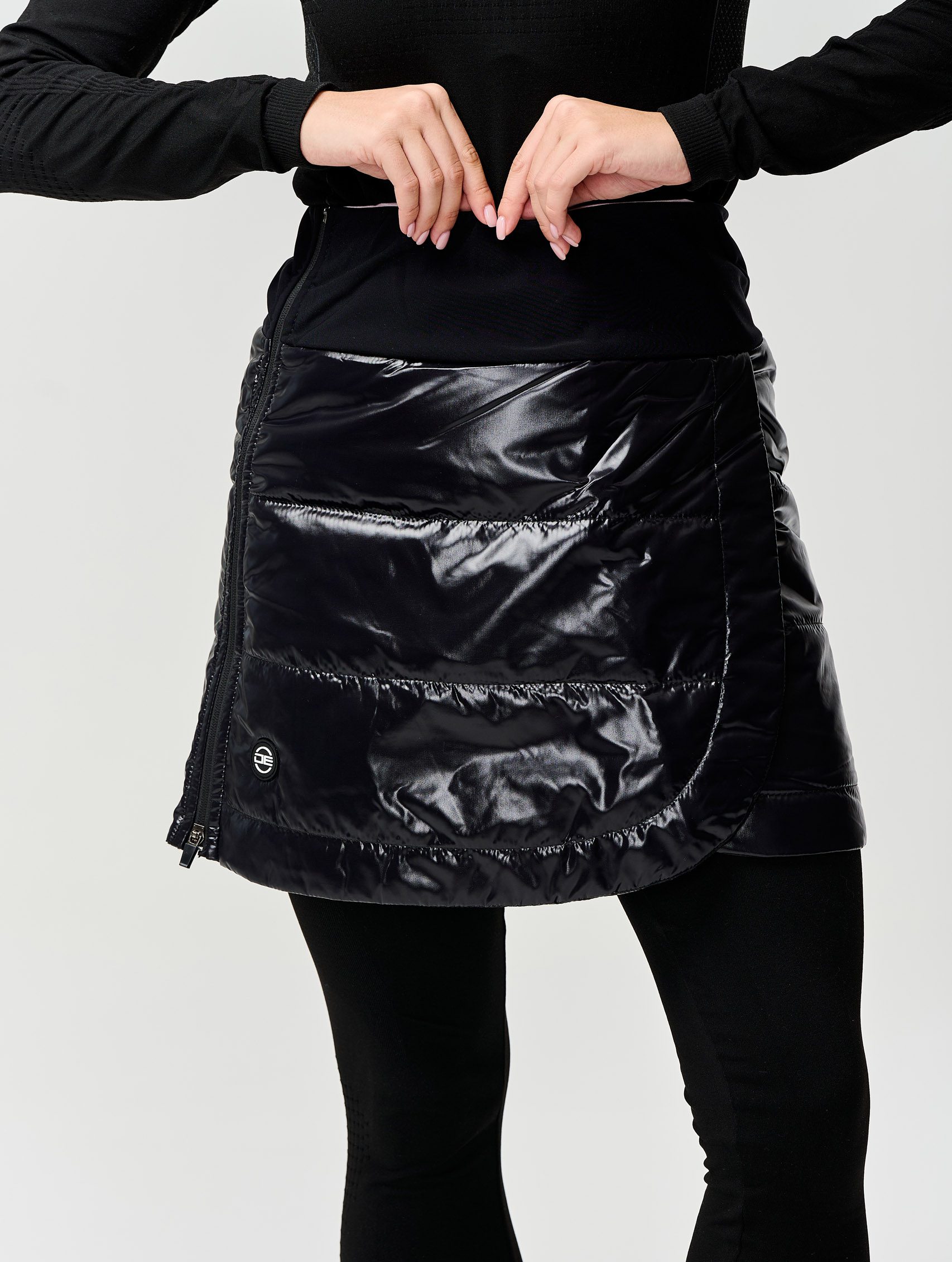Юбка сшита из тонкой нейлоновой ткани MONCLER. Это ткань особого плетения из микроволокон, которые так отражают свет, что ткань блестит. Также ткань Moncler не шуршит и очень мягкая. Она защищает от ветра и небольших осадков.