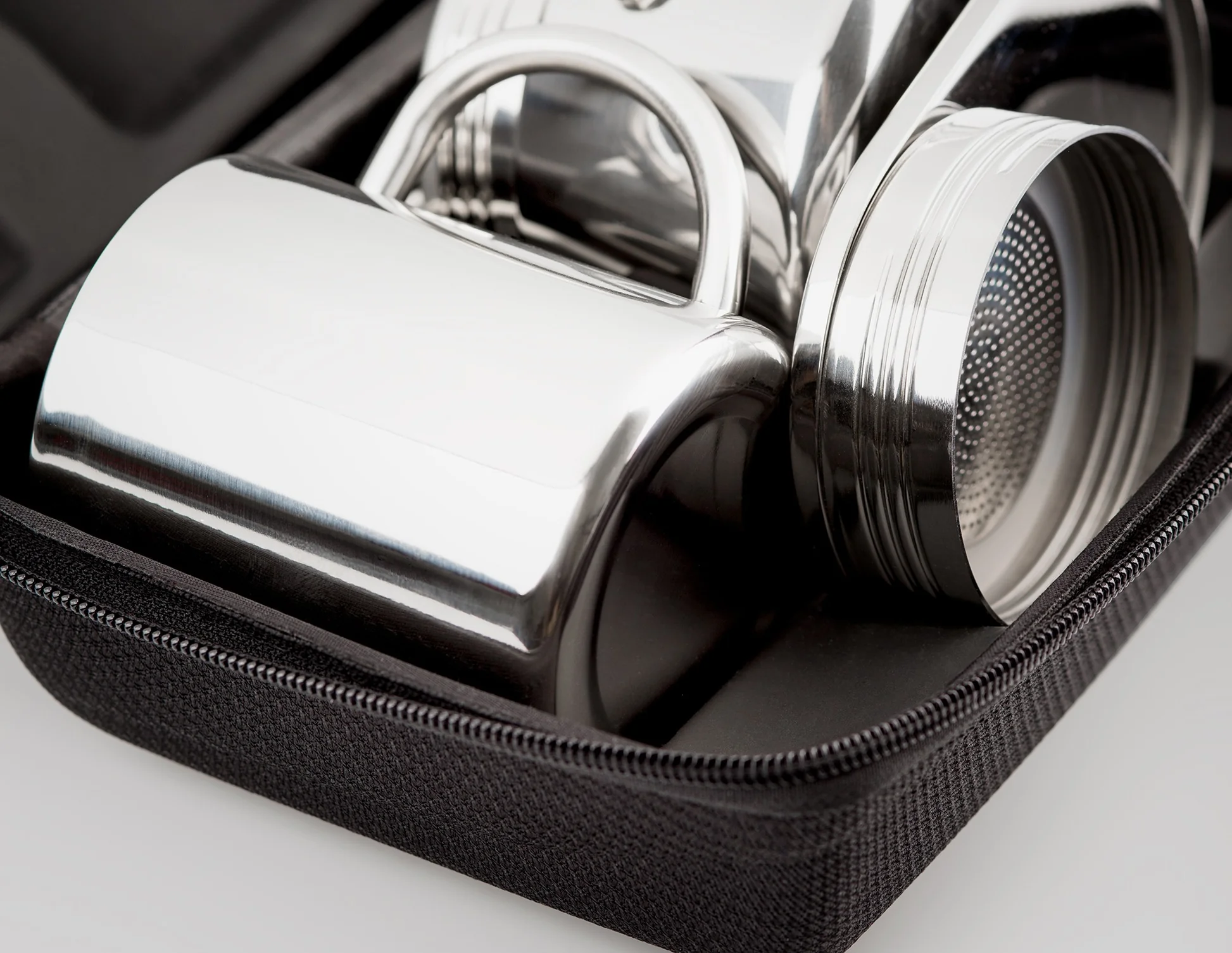Конструкция кофеварки прочная и надежная, выполнена из нержавеющей стали. Набор разбирается, транспортируется и хранится в специальном чехле.