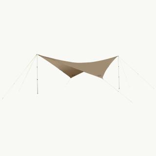 Тент 4 на 4, который образует простое, но надёжное укрытие. Можно использовать как групповое убежище для отдыха на маршруте или как укрытие для сна, под которым легко поместятся до четырех человек. Катенарный крой позволяет тенту сохранять натяжение и меньше провисать в процессе использования и при намокании. Все точки крепления оттяжек дополнительно усилены.