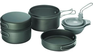 Набор посуды SOLO 2 от KOVEA мало весит и удобно складывается. В набор входят два котла (1,2 и 0,9 литра), две пиалы и складной половник. Крышки котлов можно использовать в качестве сковородок. Посуда выполнена из алюминия, что делает ее вес небольшим и удобным для похода или кемпинга. Также этот материал обладает повышенной теплопроводностью, в связи с чем приготовление пищи занимает значительно меньше времени.