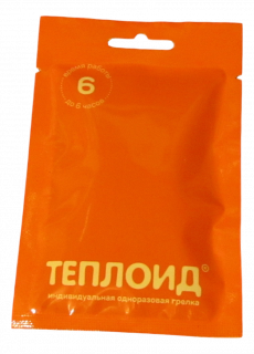 Теплоид - индивидуальная одноразовая грелка. Применяется для согревания человека на холоде. Может быть размещена во внутренних карманах одежды, в рукавицах. ТЕПЛОИД - это одноразовая грелка. Дарит тепло и комфорт в любую погоду. Не нуждается в электричестве, топливе, генерирует тепло совершенно автономно. Применяется для согревания человека на холоде. ТЕПЛОИД размещается обычно во внутренних карманах одежды, в рукавицах и т.п. ТЕПЛОИД представляет собой небольшой пакетик из нетканного полимерного воздухопроницаемого материала. Пакетик наполнен тепловыделяющей смесью. Смесь состоит из натуральных компонентов: порошок железа, вода, активированный уголь, природные минералы. Тепло выделяется в результате ускоренного окисления кислородом железа, когда пакетик, будучи извлечен из упаковки, окажется на воздухе. ТЕПЛОИД начинает выделять тепло ровно через несколько минут после извлечения его из герметичной оранжевой упаковки (наружного пакета) и продолжает греть в течение времени, указанного на упаковке (6 часов). Средняя температура 50° С, максимальная 60° С.