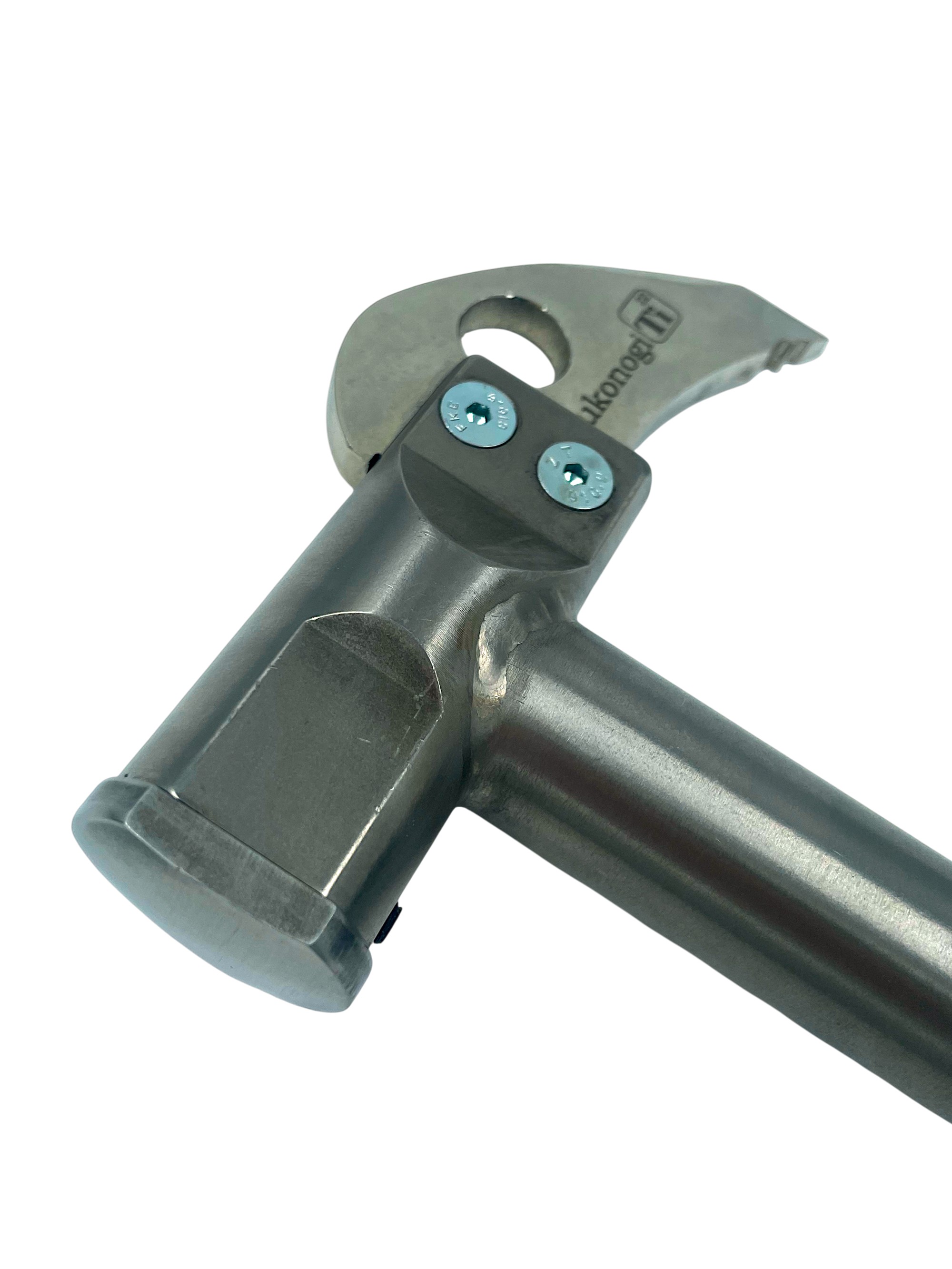 Молоток скальный KRUKONOGI.COM титановый безынерционный — альпинистский молоток представляет собой надежный и высококачественный инструмент, выполненный из титана, что обеспечивает его легкость и прочность. Клюв и боёк изготовлены из бронестали, что гарантирует долговечность и устойчивость к износу. Боёк сферической формы позволяет сохранять эффективность удара даже при неидеальной точности, поскольку векторы удара совпадают независимо от положения молотка, что делает работу более точной и удобной. Специальная конструкция молотка исключает соскакивание и отскок при использовании, обеспечивая безопасное и комфортное обращение.