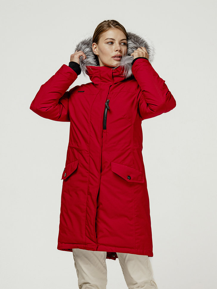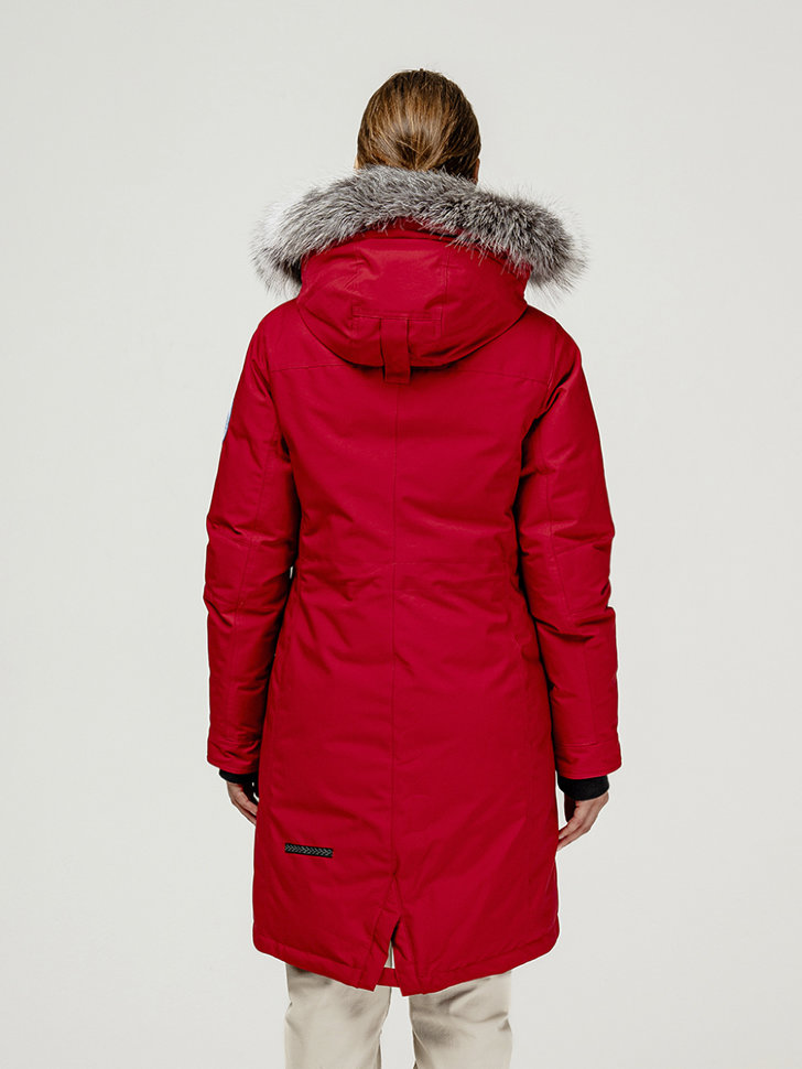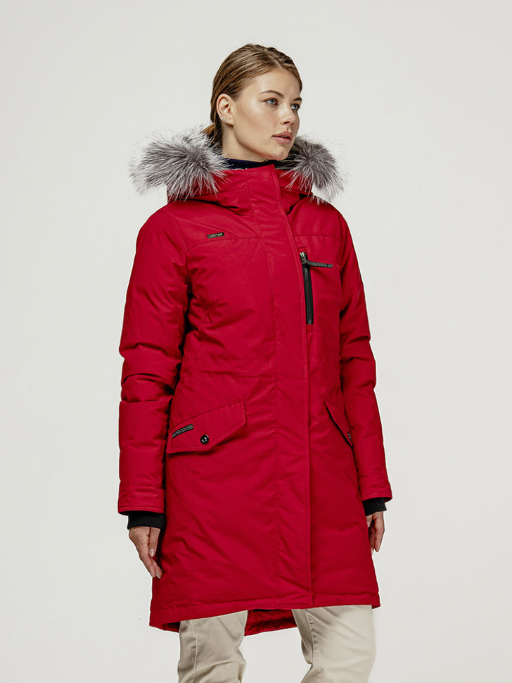 Зимняя парка LAPLANGER для женщин. Куртка утеплена натуральным гусиным пухом, в районе спины и плеч дополнительно защищает от холода материал Thermium. Верхняя ткань сделана из износостойкого материала Top Arctic, который не боится осадков, грязи и экстремальных температур ниже нуля. Внутри есть утяжка по талии, что лишний раз не даст морозу к вам пробраться. Объемный капюшон оснащен опушкой из меха северного енота. У куртки несколько внешних карманов, все утеплены мехом. Также есть два внутренних, на молнии и сетчатый.