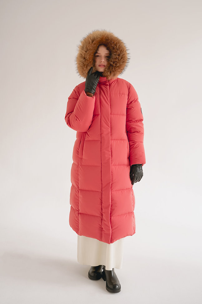 Натуральный гусиный пух высокого качества обеспечивает максимальную защиту от холода. В области спины и плеч на подкладке сделаны вставки из мягкого материала Shelter Loft. Объемный капюшон обрамлен опушкой из натурального меха северного енота, что обеспечивает тепло голове и шее. Внутри есть небольшая ветрозащитная юбка, которую можно утянуть. Все карманы куртки на молнии, внешние утеплены искусственным мехом. Технология теплых швов исключает продувание, дополнительно защищая от холода.