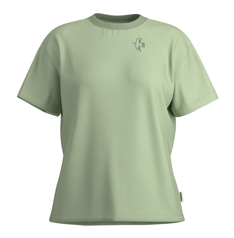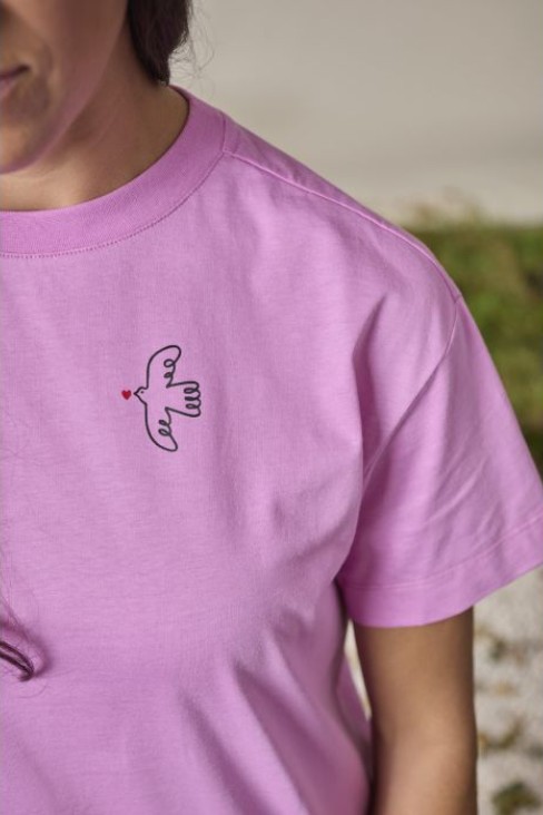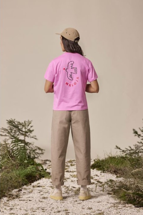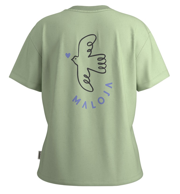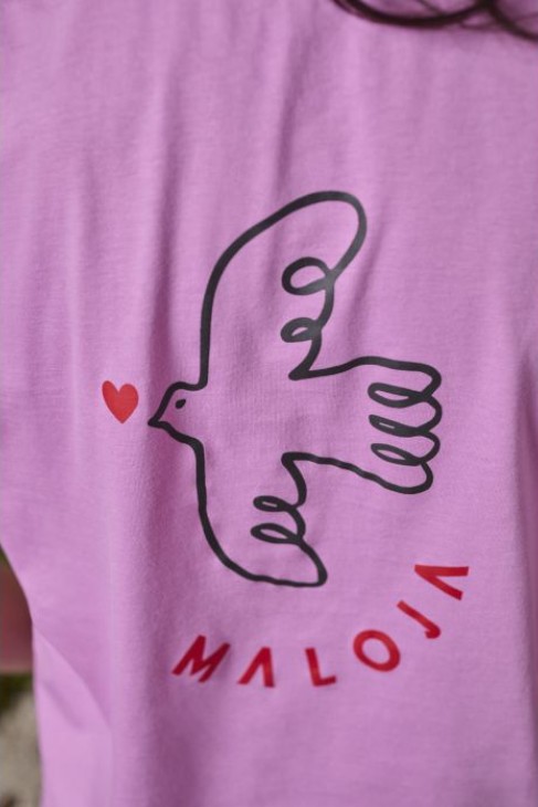 Особое внимание привлекает авторский принт: на груди — изящный голубь, символ мира и свободы, окруженный нежным сердцем и узнаваемой надписью Maloja. На спине — крупный рисунок, который прекрасно подчеркивает индивидуальность и дух коллекции. Эта футболка легко станет повседневным фаворитом и подчеркнет ваше чувство стиля с заботой о природе.
