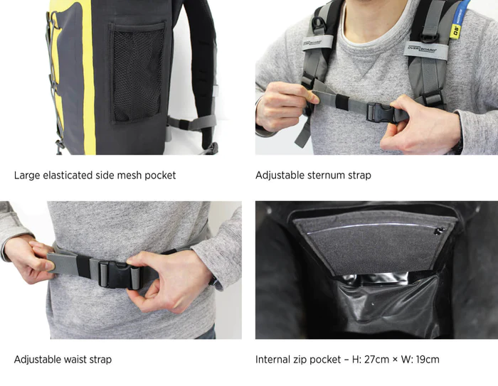 Водонепроницаемый рюкзак на 20 литров для активного отдыха на воде и в ненастную погоду. Рюкзак выдерживает падение в воду и небольшое погружение. Защищает вещи от влаги, воды, пыли, грязи, песка и снега. Мягкие лямки удобно сидят на плечах, пояс помогает перенести нагрузку на бедра. Есть светоотражающие элементы. Рюкзак закрывается сверху и сбоку. Есть внутренний карман на молнии, внешний сетчатый карман, снаружи многофункциональное крепление со шнуром.