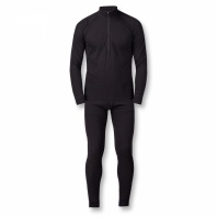 Теплое белье с воротником-стойкой на молнии из смесовой ткани: шерстяные волокна греют, а нити акрила и полипропилена добавляют белью эластичности и сокращают время испарения влаги.
