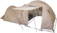 Большая палатка для кемпинга. Модель имеет огромный тамбур, позволяющий встать в полный рост. Палатка обладает простым в установке и исключительно прочным каркасом. Полог палатки можно преобразовать в небольшой навес для защиты от солнца и осадков или организации обеденной зоны. В модели продуманы три входа, вентиляционные окна на молнии, входы внутренней палатки продублированы противомоскитными сетками.