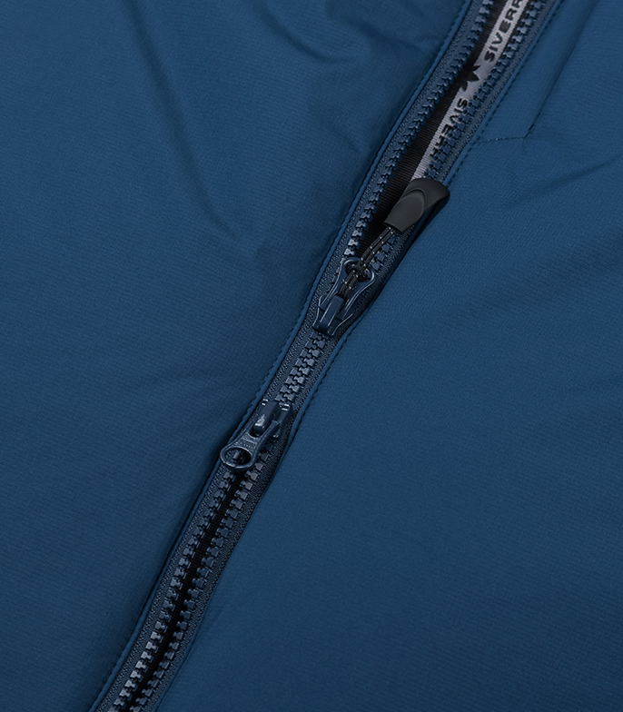 Центральная двухзамковая молния с тёплой без сквозного шва внутренней планкой.