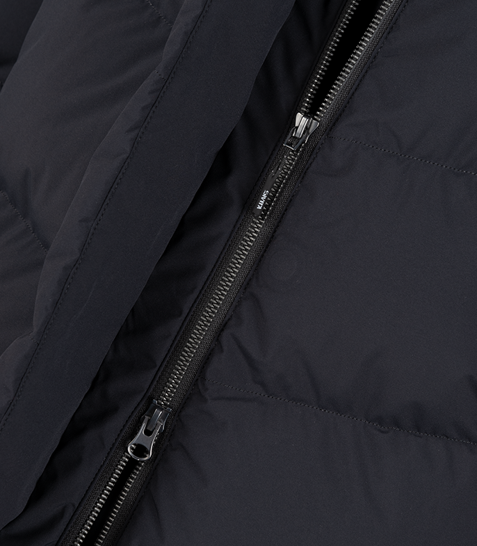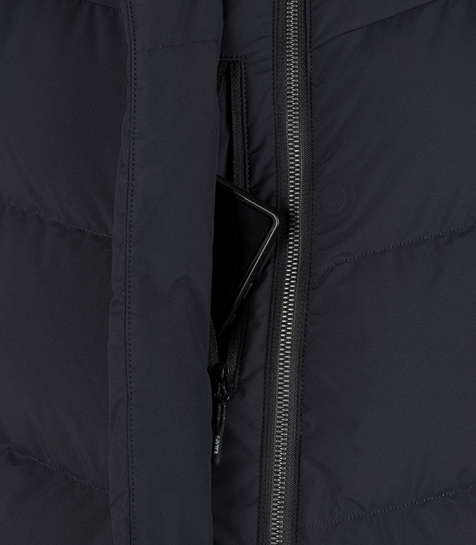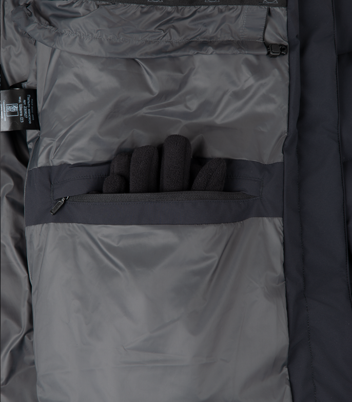 - Два теплых боковых кармана на молнии под цельнокроенными планками. Один теплый нагрудный карман на молнии с доступом под планкой центральной молнии. Один внутренний карман на молнии