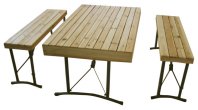 Оригинальный деревянный набор мебели для кемпинга. Ножки у стола и скамеек имеют дополнительные соединения внизу: это придает и столу, и скамейкам большую устойчивость, так как ножки не проваливаются в песок. Скамейки легко складываются внутрь стола, который имеет дополнительную ручку для удобной транспортировки. Очень удобен для использования на дачах и фазендах.